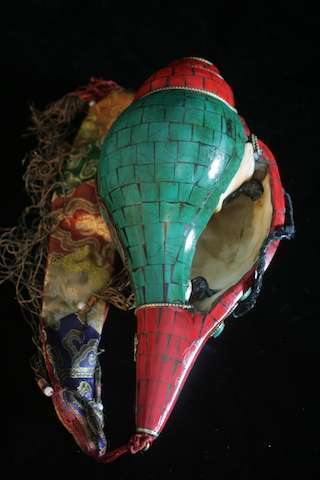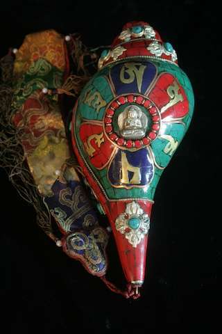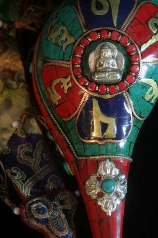 Stone inlay OM MANE PADME HUM with white metal Buddha/vajras
