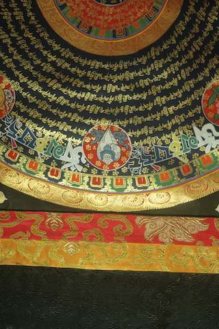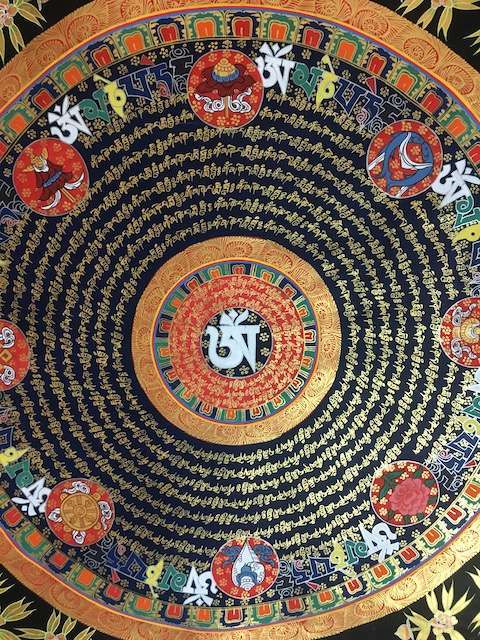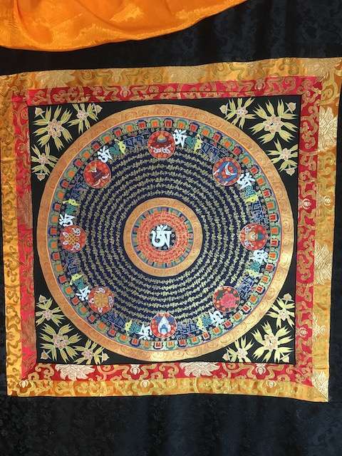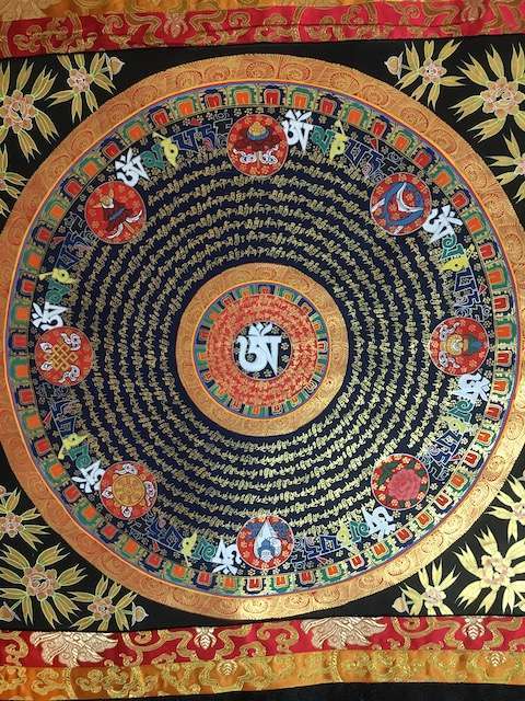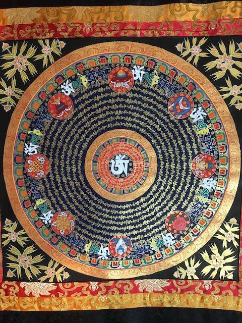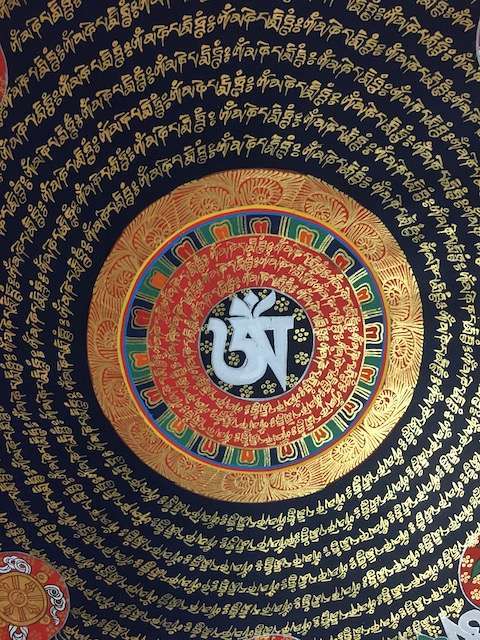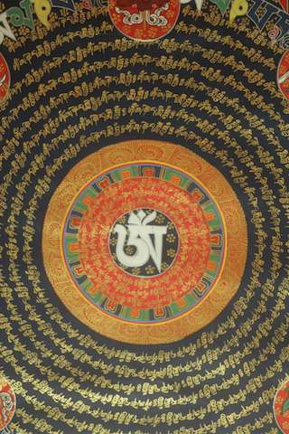 Mandala thangka with Tibetan Om at centre and Om mane Padme hum mantra
