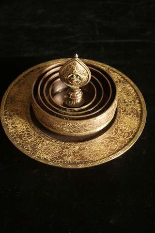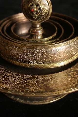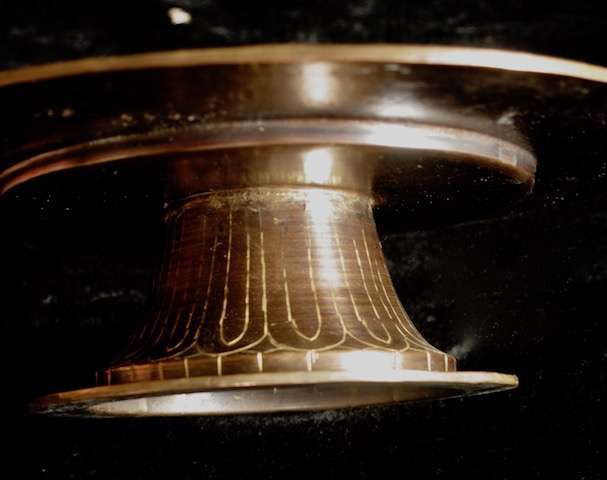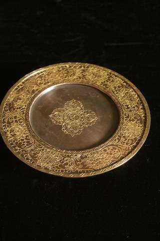 Stand 17cm wide, mandala base 10cm wide. Copper with gold inlay