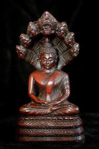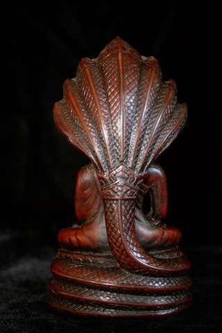 Four weeks after Gautama Buddha began meditating under the Bodhi Tree a great rain descended. However, the mighty King of Serpents, Mucalinda, came from beneath the earth and protected with his hood the one who is the source of all protection. When the great storm had cleared, the serpent king assumed his human form, bowed before the Buddha, and returned in joy to his palace.