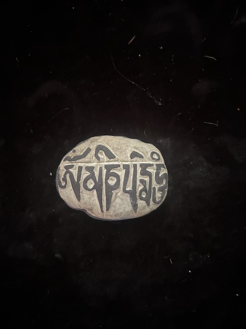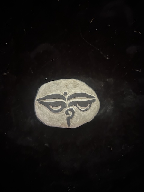 Om mane padme hum in Tibetan on one side Buddha eyes on reverse