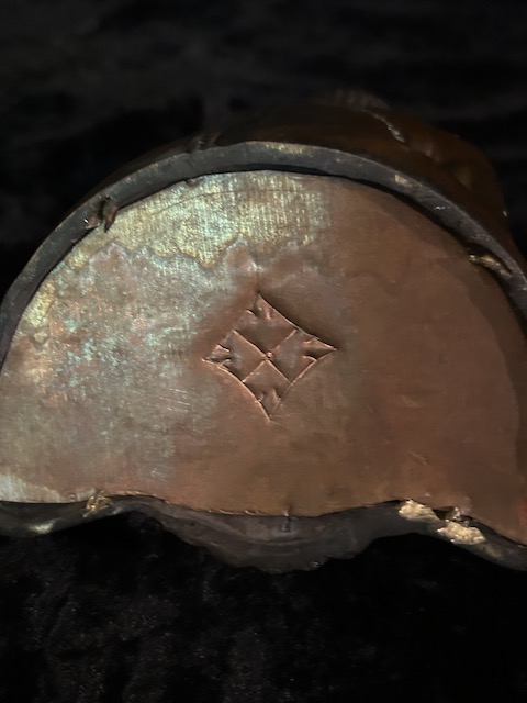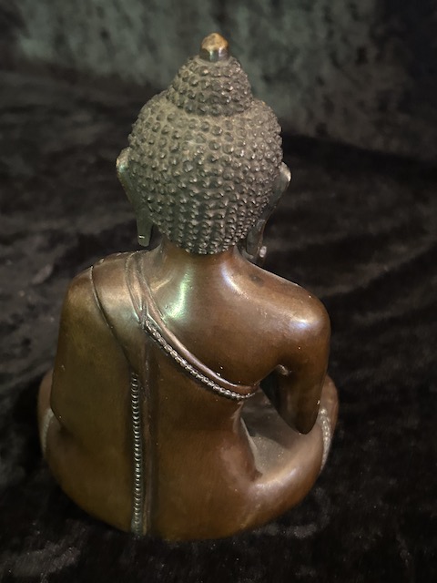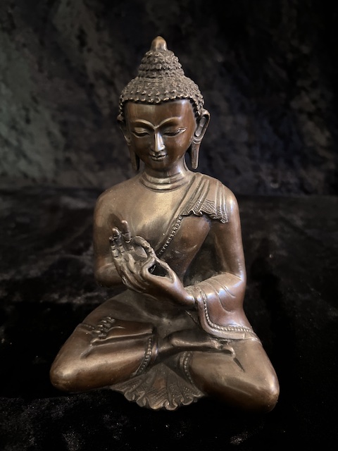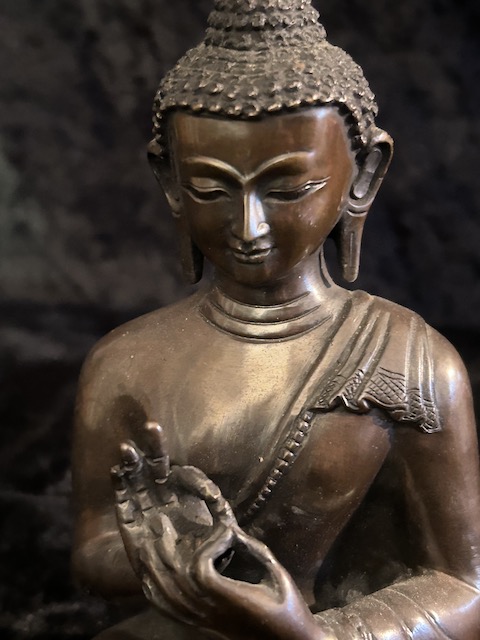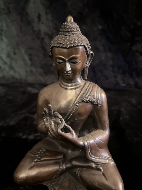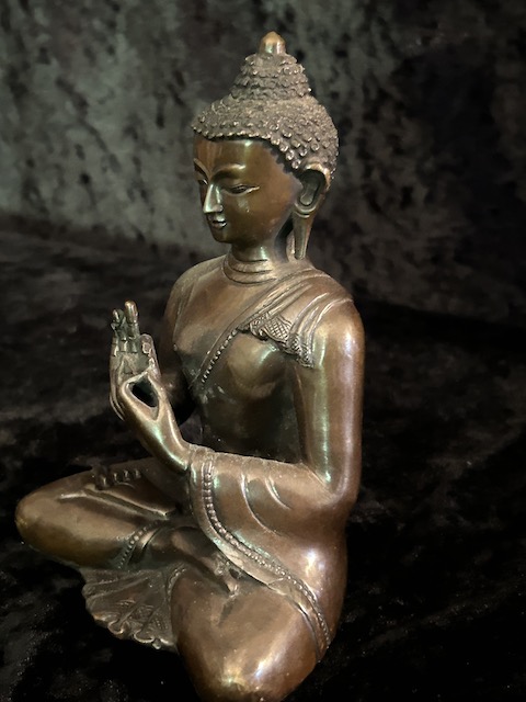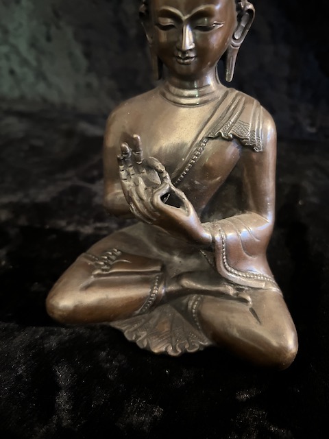 Vairocana Buddha statue in copper 15cm . Vairocana ( the illuminator) who is at the centre, with all-pervading wisdom, like a sun shining equally on all – his mantra is om vairocana hum
