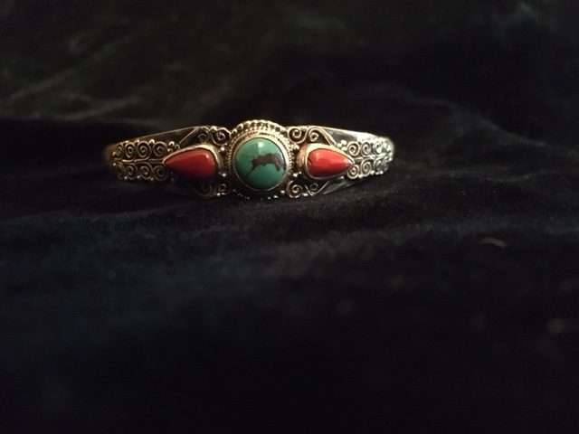 With Filigree and Turquoise/Red coral stones, adjustable to fit wrist