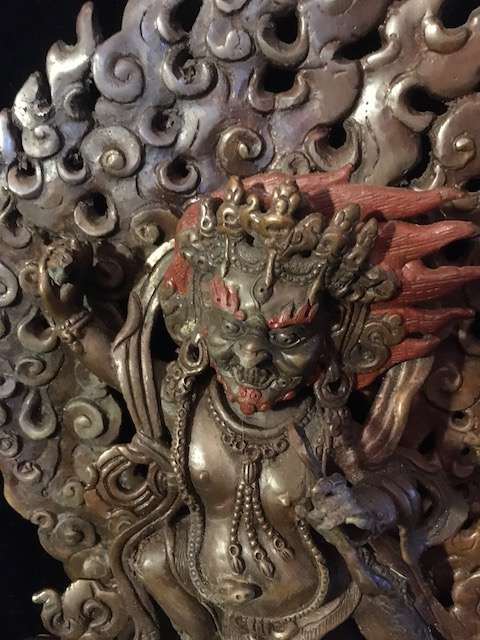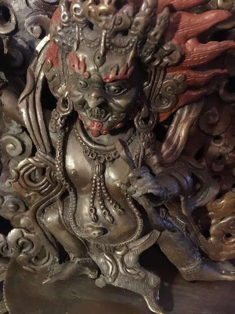Vajrapani is widely represented in Buddhist iconography as one of the three protective deities surrounding the Buddha. Each of them symbolizes one of the Buddha’s virtues: Manjusri manifests all the Buddhas’ wisdom, Avalokitesvara manifests all the Buddhas’ compassion and Vajrapani manifests all the Buddhas’ energy and power as well as the power of all five Buddhas